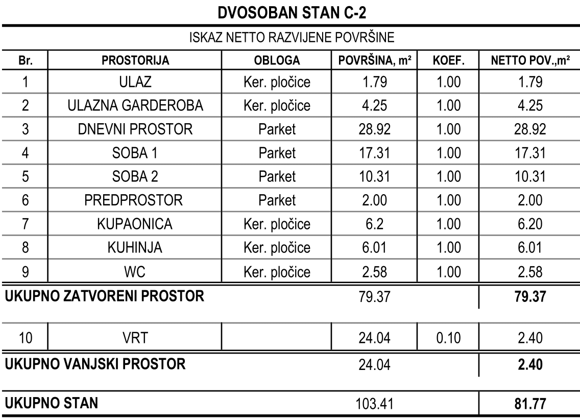 Stan C-2 oduševljava svojom ukupnom podnom površinom od 103,41 m² (NKP 81,77 m²) skladno povezujući elegantan interijer i zeleni eksterijer.
