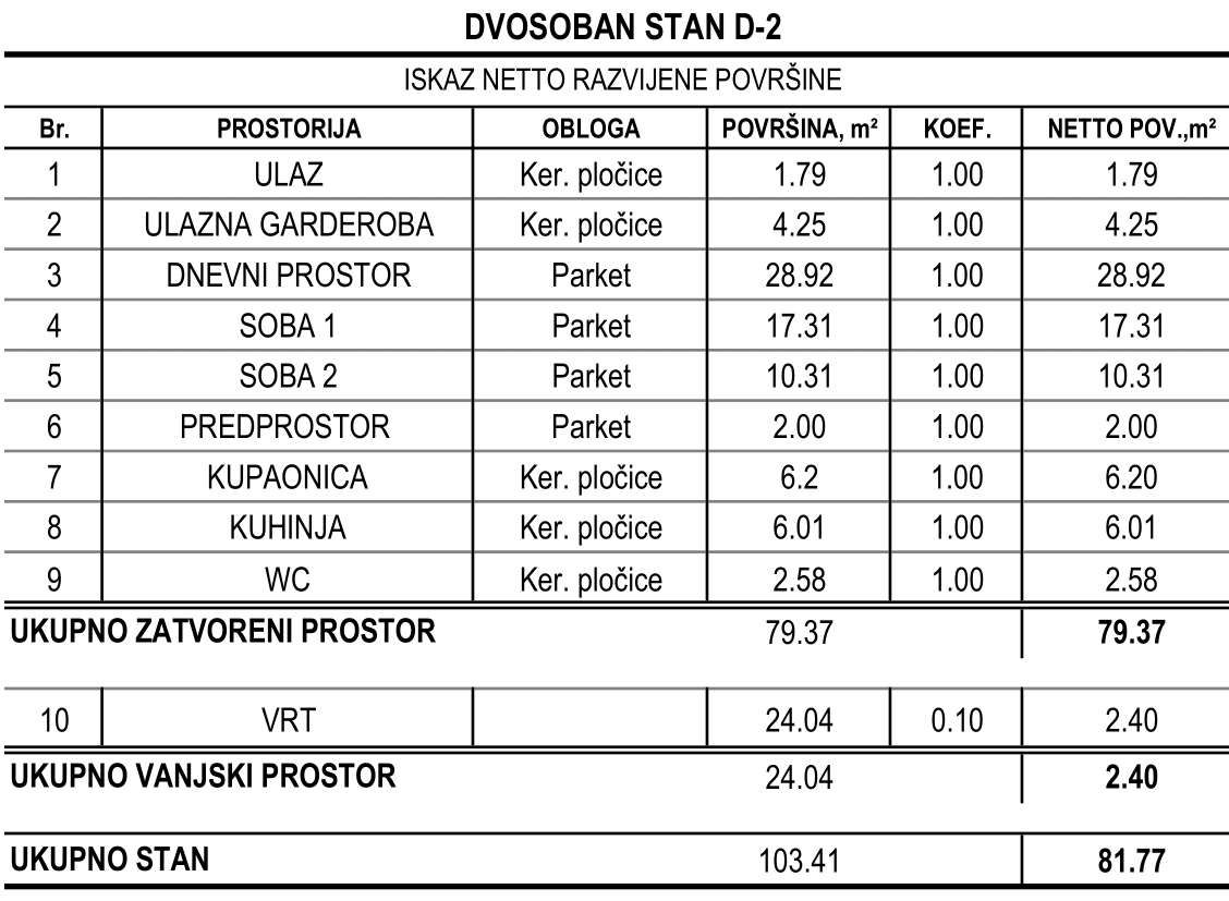 Stan D-2 oduševljava svojom ukupnom podnom površinom od 103,41 m² (NKP 81,77 m²) skladno povezujući elegantan interijer i zeleni eksterijer.
