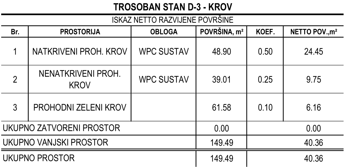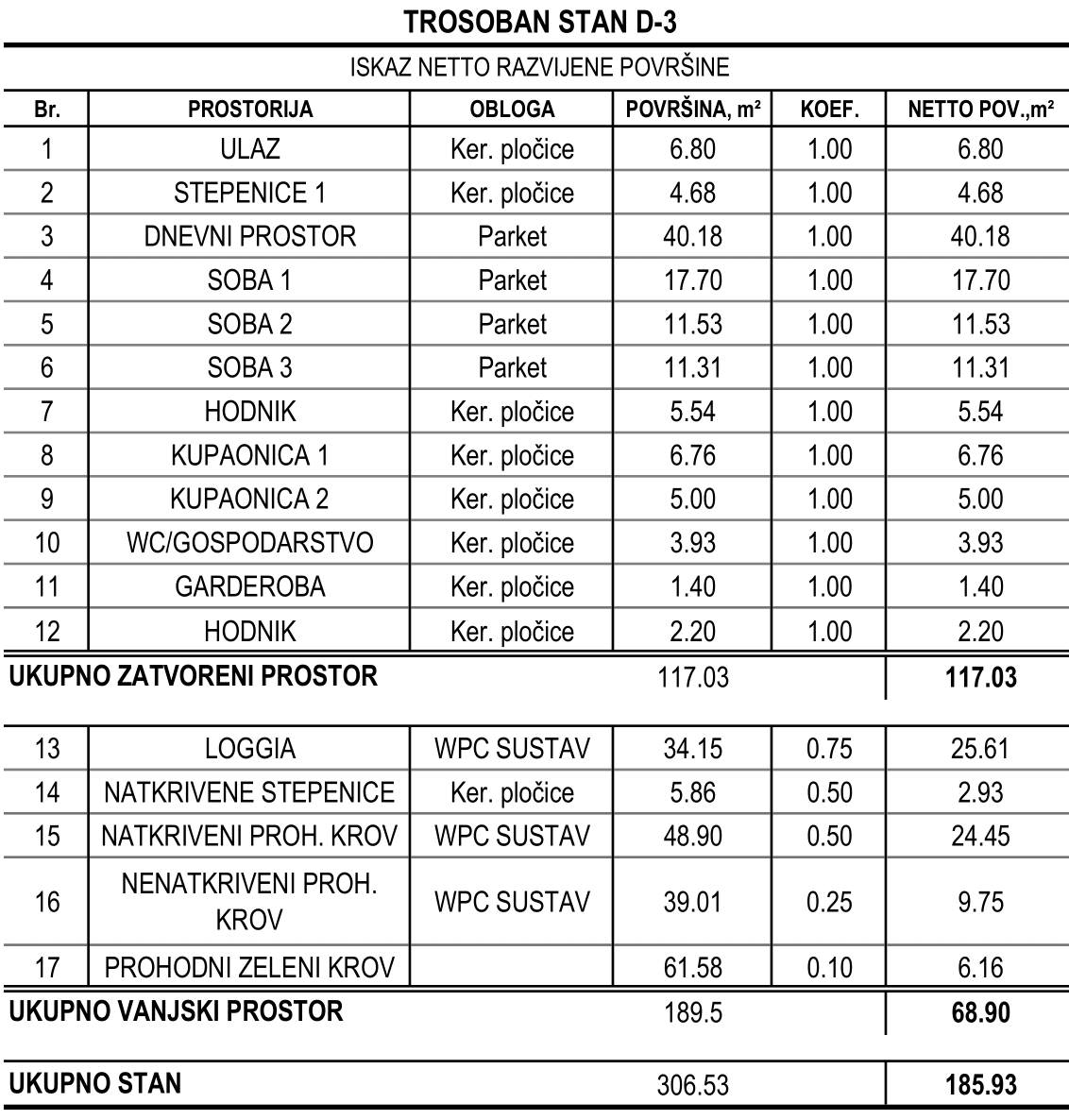 Stan D-3 impresionira svojom ukupnom podnom površinom od 306,53 m² (NKP 117,03 m²) koja pruža osjećaj raskoši, slobode i potpunog komfora. U sklopu