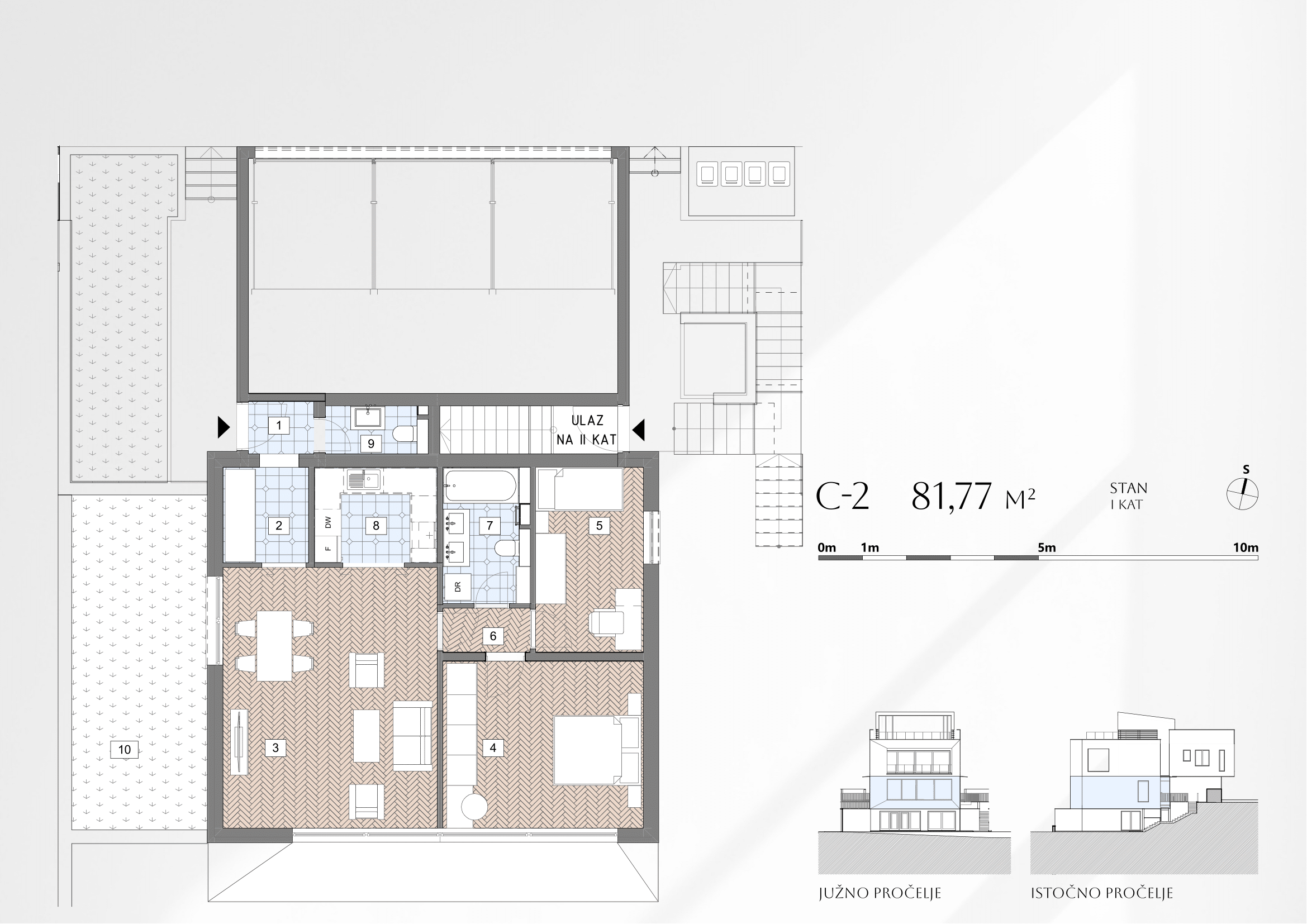 Stan C-2 oduševljava svojom ukupnom podnom površinom od 103,41 m² (NKP 81,77 m²) skladno povezujući elegantan interijer i zeleni eksterijer.