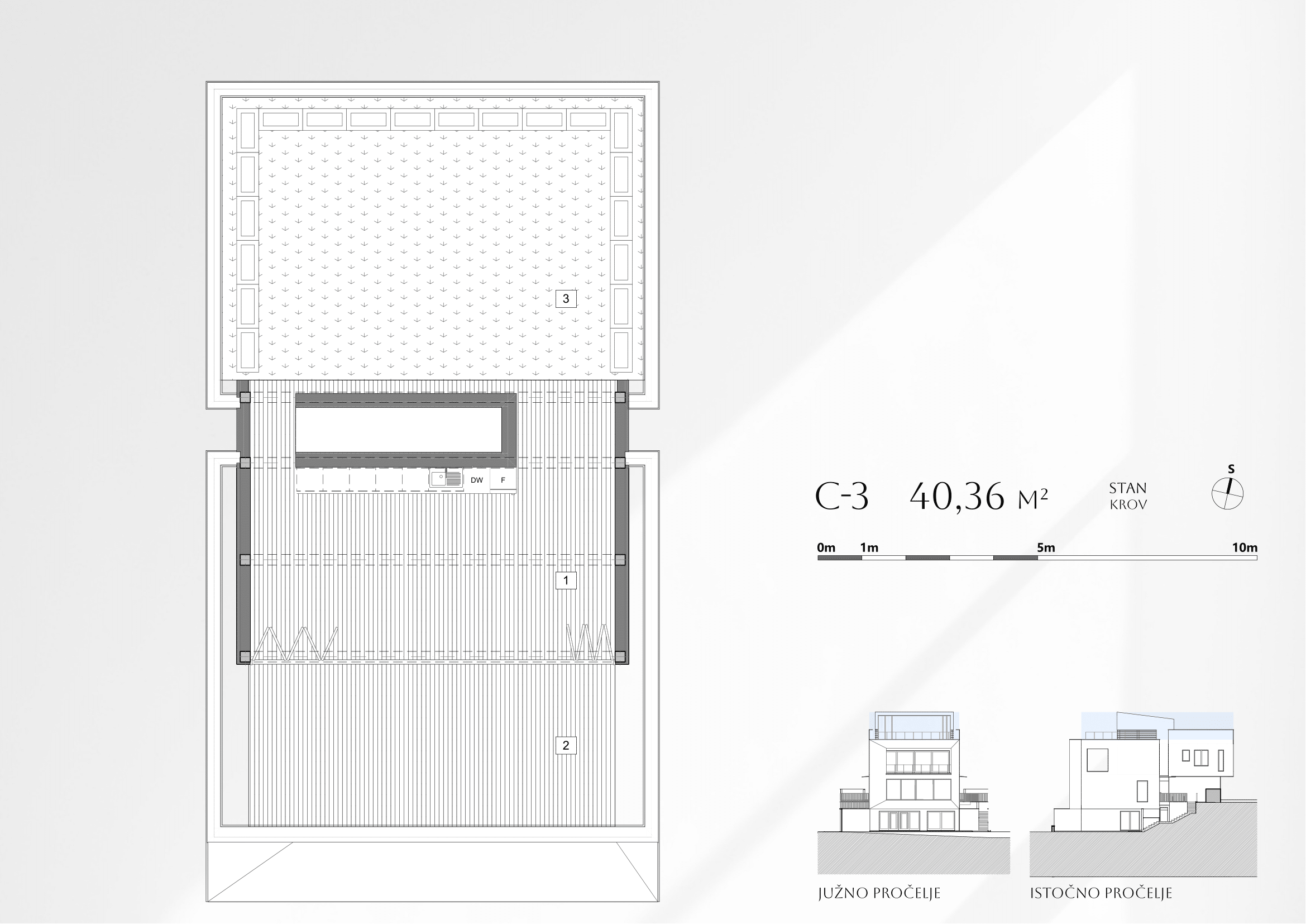Stan C3 pruža prostran i suvremen raspored s ekskluzivnim krovnim prostorom koji uključuje terasu i ljetnu kuhinju. Idealan je za one koji žele spoj luksuza, udobnosti i privatnog prostora za uživanje na otvorenom.
