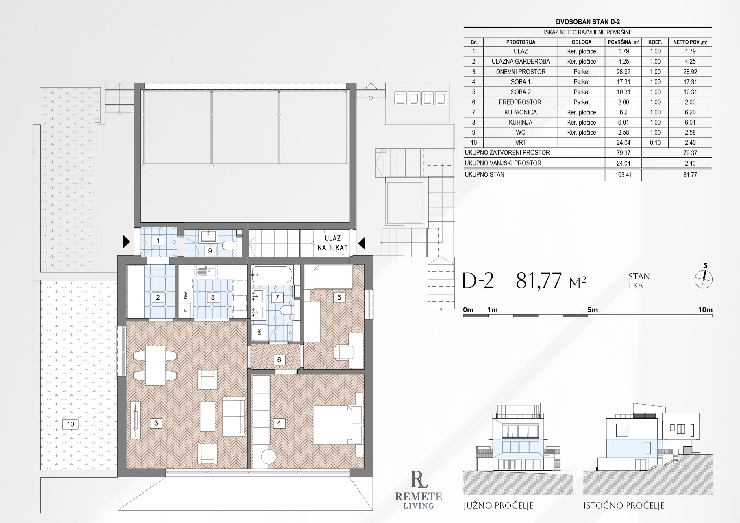 Stan D-2 oduševljava svojom ukupnom podnom površinom od 103,41 m² (NKP 81,77 m²) skladno povezujući elegantan interijer i zeleni eksterijer.