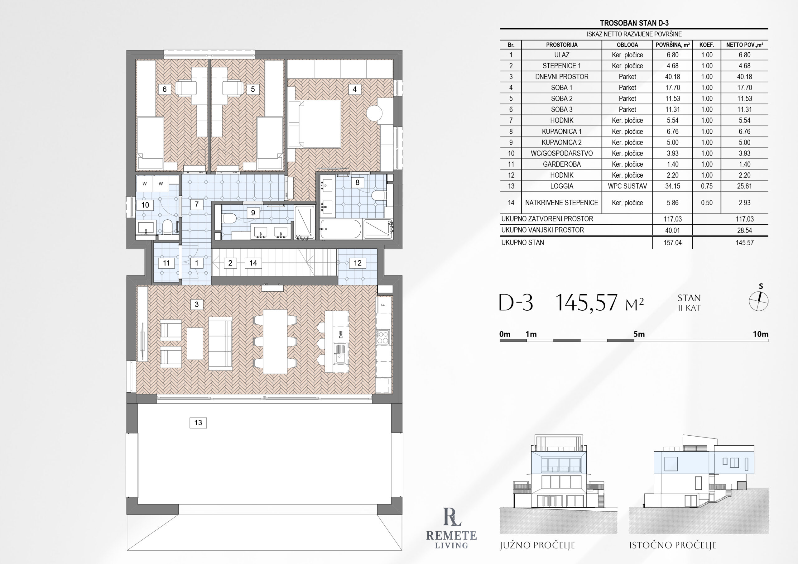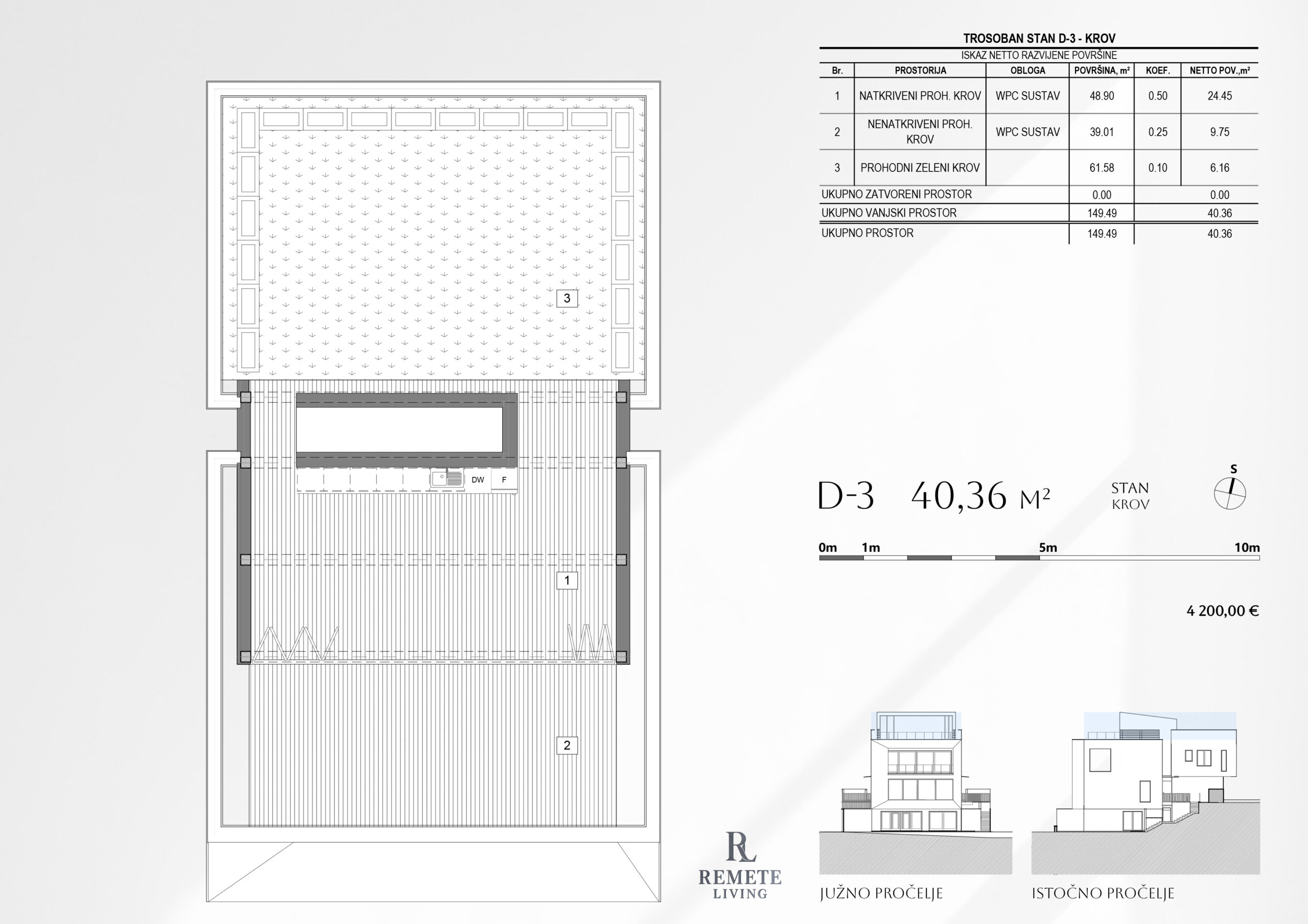 Stan D3 prostire se na 306,53 m² stambene površine i nudi izniman komfor. Poseban adut ovog stana je krovna terasa s ljetnom kuhinjom od 149,49 m², koja pruža jedinstven prostor za odmor i druženje na otvorenom.